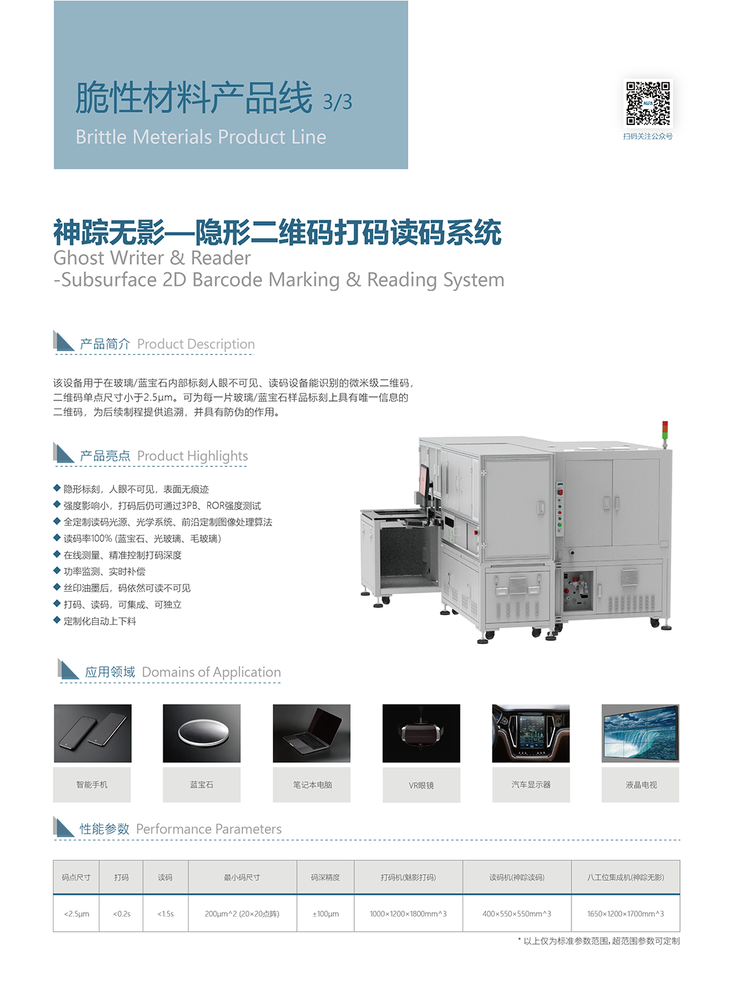 該設(shè)備用于在玻璃/藍(lán)寶石內(nèi)部標(biāo)刻人眼不可見(jiàn)、讀碼設(shè)備能識(shí)別的微米級(jí)二維碼,