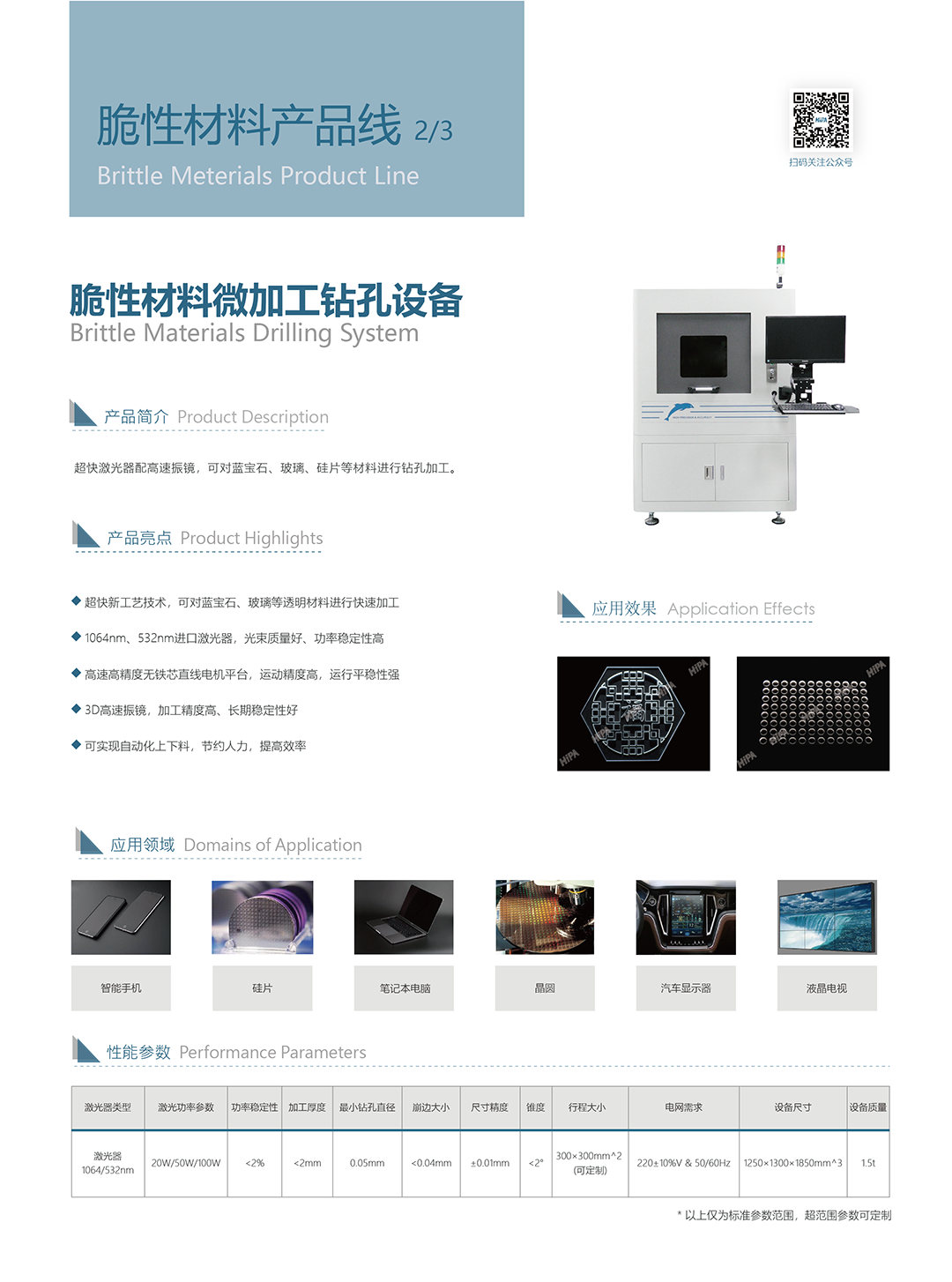 1、超快新工藝技術,可對藍寶石、玻璃等透明材料進行快速加工 2、1064nm、532nm進口激光器,光束質量好、功率穩定性高 3、高速高精度無鐵芯直線電機平臺,運動精度高,運行平穩性強 4、3D高速振鏡,加工精度高、長期穩定性好 5、可實現自動化上下料,節約人力,提高效率