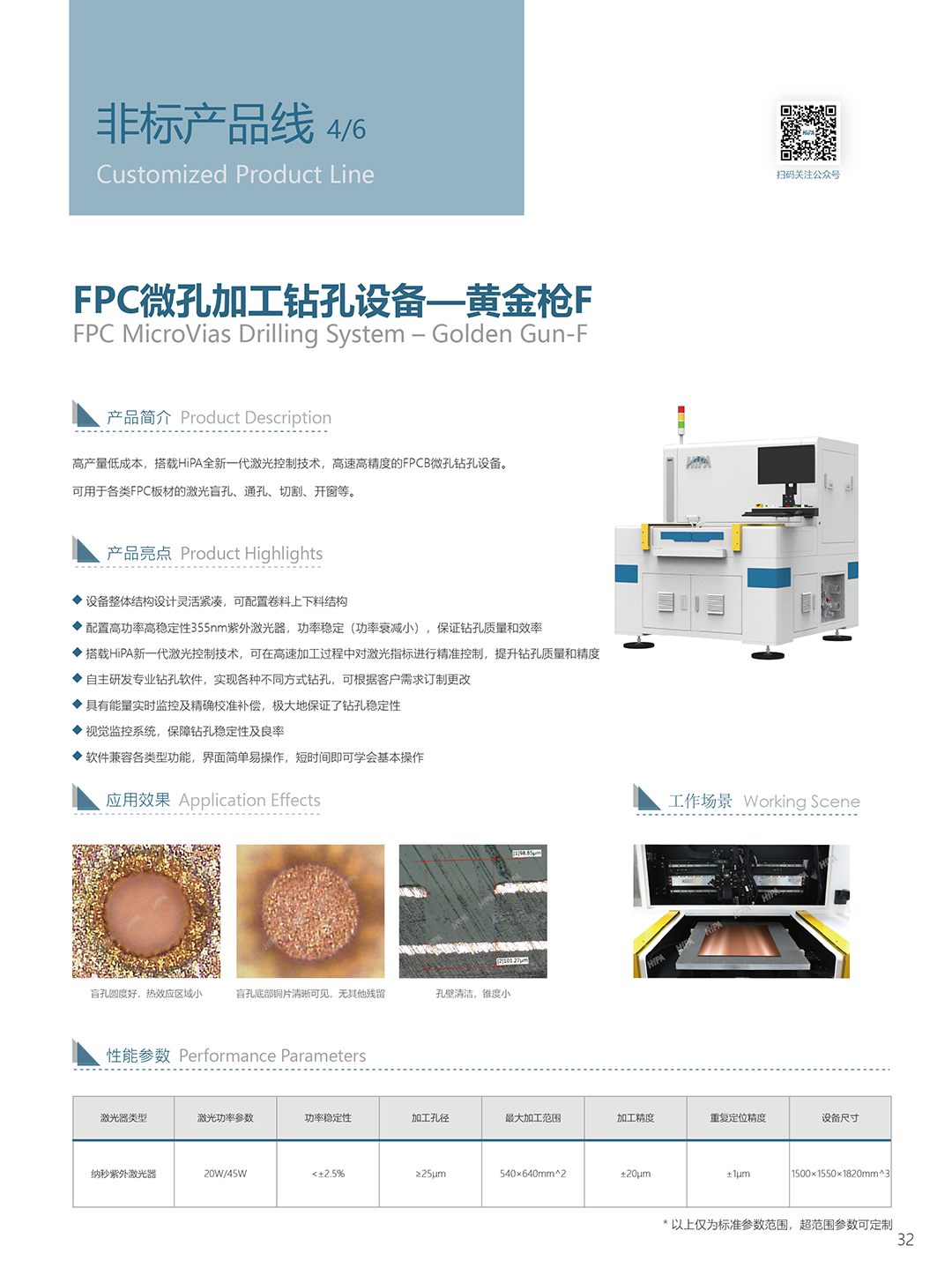 高產量低成本,搭載HiPA全新一代激光控制技術,高速高精度的FPC微孔鉆孔設備。高產量低成本,搭載HiPA全新一代激光控制技術,高速高精度的FPC微孔鉆孔設備。可用于各類FPC板材的激光百孔.通孔、切割、開窗等。