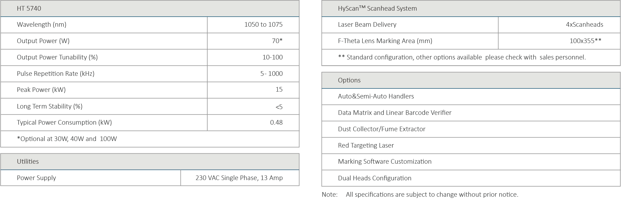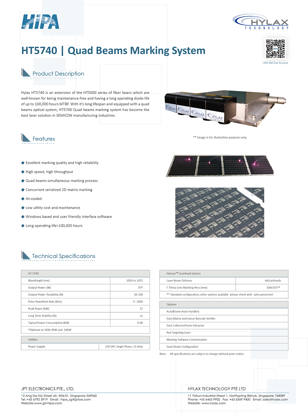 Hylax HT5740 is an extension of the HT5000 series of fiber lasers which are well-known for being maintenance-free and having a long operating diode life of up to 100,000 hours MTBF. With it’s long lifespan and equipped with a quad beams optical system, HT5740 Quad beams marking system has become the best laser solution in SEMICON manufacturing industries.