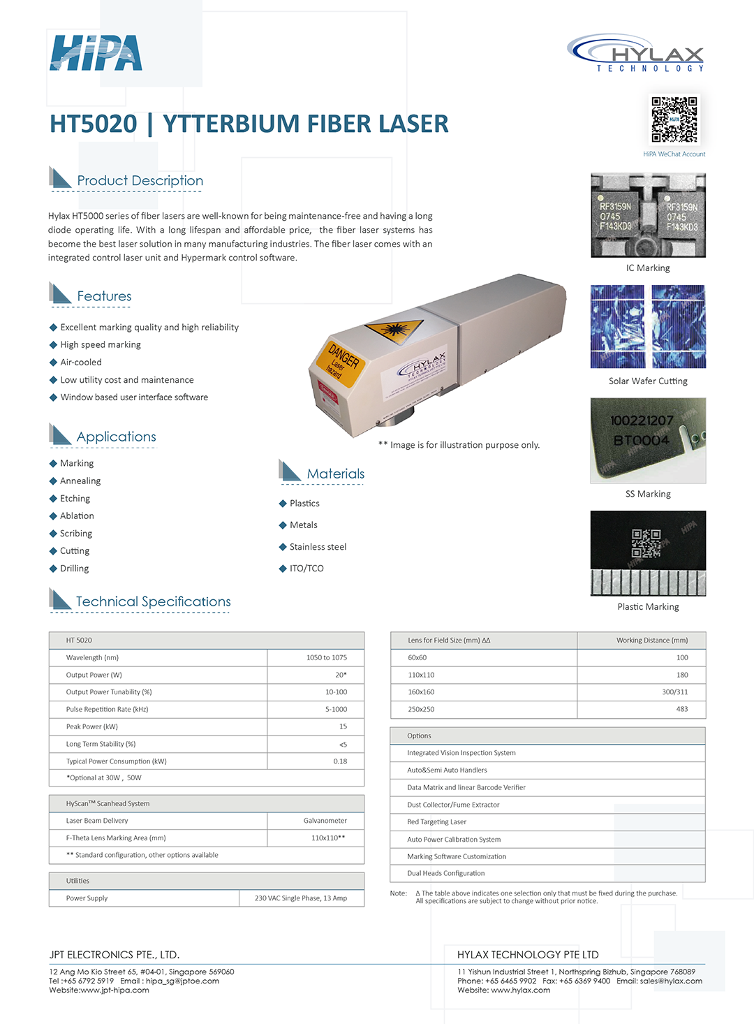 Hylax HT5000 series of fiber lasers are well-known for being maintenance-free and having a long diode operating life. With a long lifespan and affordable price, the fiber laser systems has become the best laser solution in many manufacturing industries. The fiber laser comes with an integrated control laser unit and Hypermark control software.