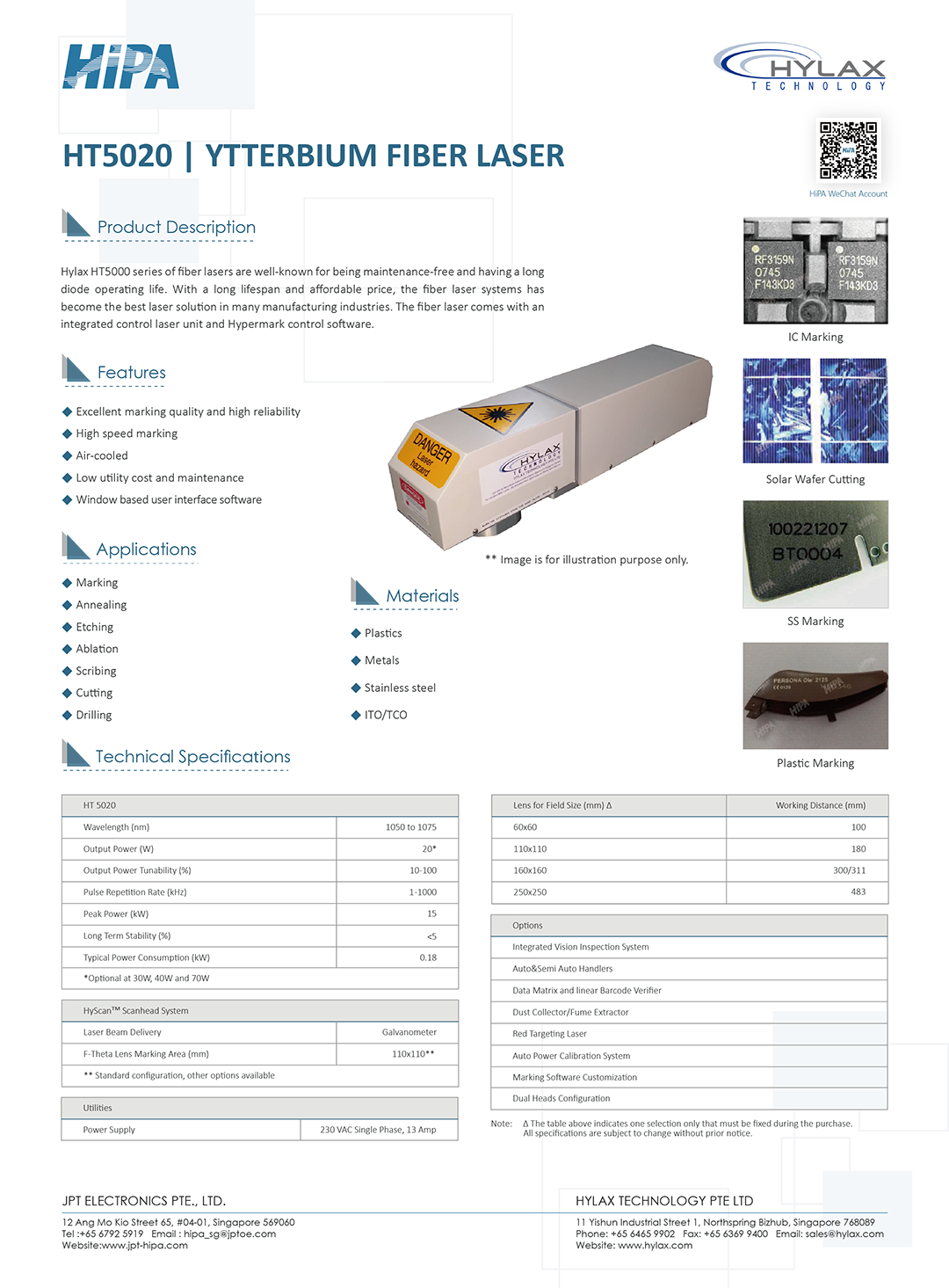 Hylax HT5000 series of fiber lasers are well-known for being maintenance-free and having a long diode operating life. With a long lifespan and affordable price, the fiber laser systems has become the best laser solution in many manufacturing industries. The fiber laser comes with an integrated control laser unit and Hypermark control software.